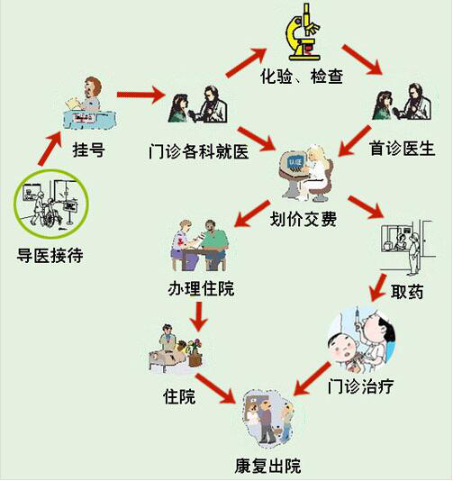 拿好相关检查结果到门诊科室,将结果交于医生,医生会做出相应诊断和处理措施;如果需要住院治疗一般都有导医或者护士带你去办住院手续;康复出院。